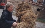 Im Kirmesumzug wird wie immer auch der Erbsenbär durch das Dorf geführt, der nach einer kleinen Spende auch gern mal bei einen Ständchen ein Tänzchen einlegt.